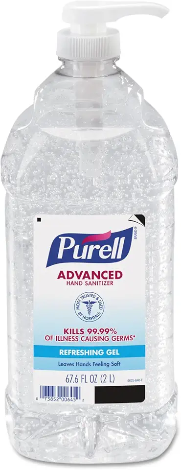 PURELL Advanced Gel (2-Liter pump bottle, 4.5 lbs). Clean scent, family-size, long-lasting protection. 1-year warranty.